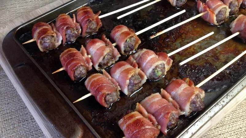 - Thread the bacon-wrapped meatballs onto kebab sticks or secure each with a toothpick.