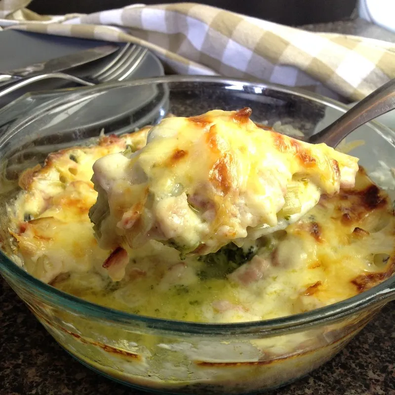 - Sprinkle the leek and bacon mixture over the broccoli in the casserole dish.