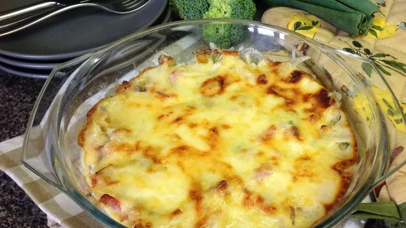 - Pour the cheese sauce evenly over the broccoli, bacon, and leek mixture.