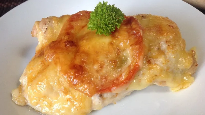 - Place some grated cheese on one half of each chicken breast, then top with a slice of tomato.