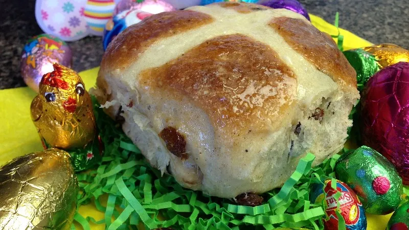 Soft, spiced, and studded with sweet fruit, these golden Hot Cross Buns are fresh from the oven and brushed with a glossy glaze. Perfect warm with a slather of butter for a true old-school Easter treat.