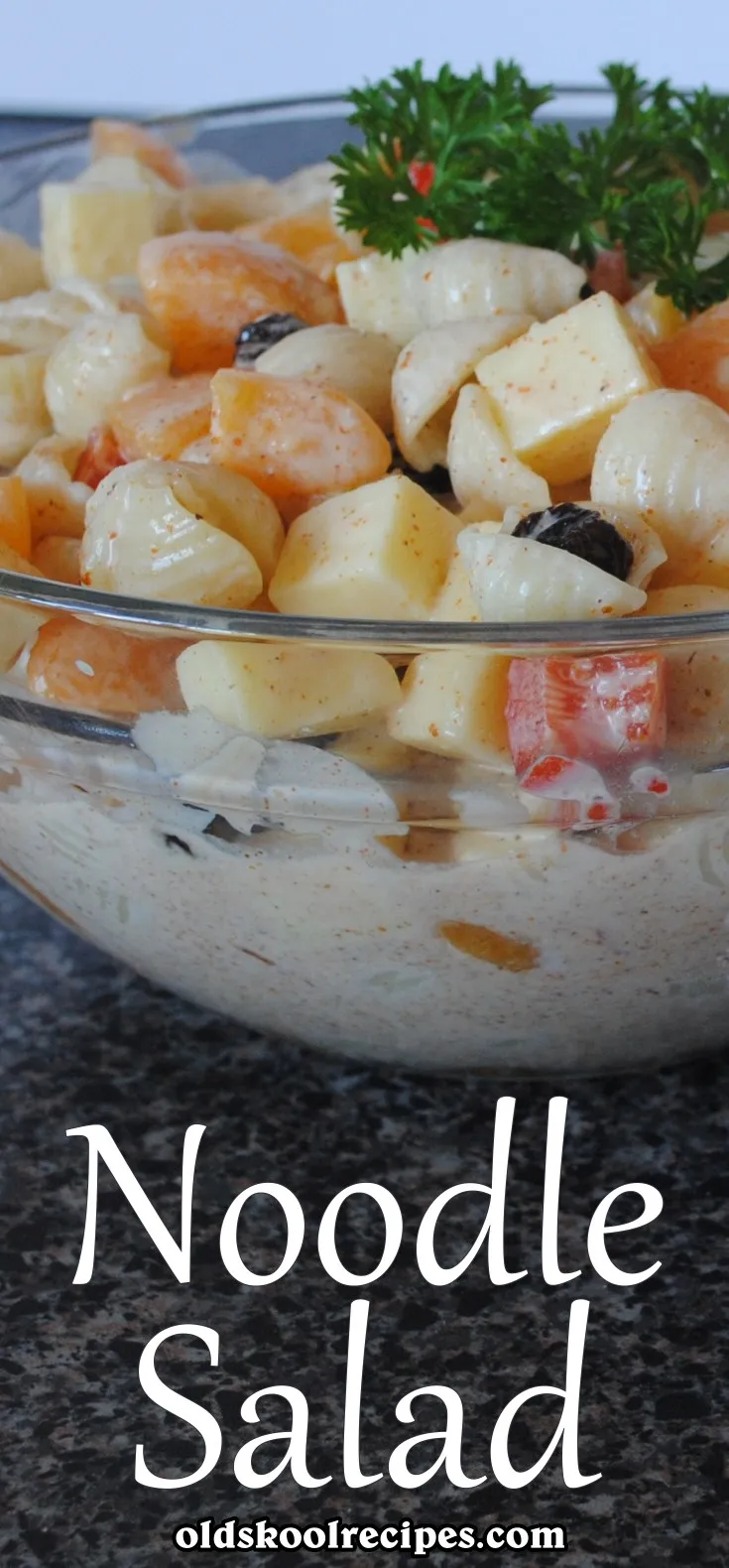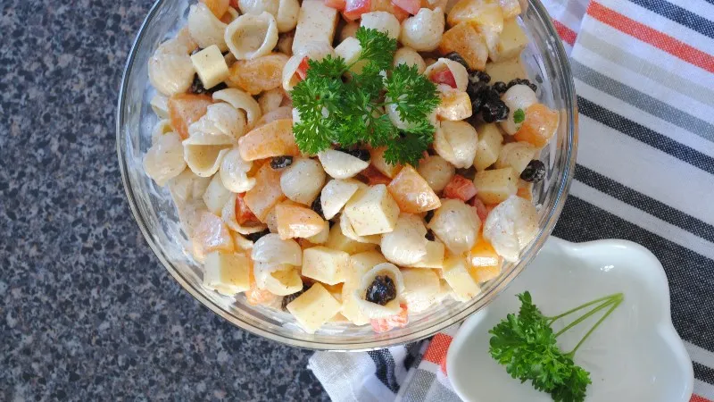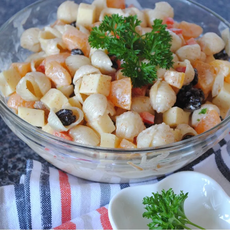 - In a large mixing bowl, combine the cooked noodles, chopped peaches, 3/4 cup cheese, 1/2 red or green pepper (diced), 1 onion (chopped), and 1/2 cup sultanas.