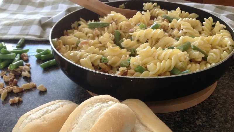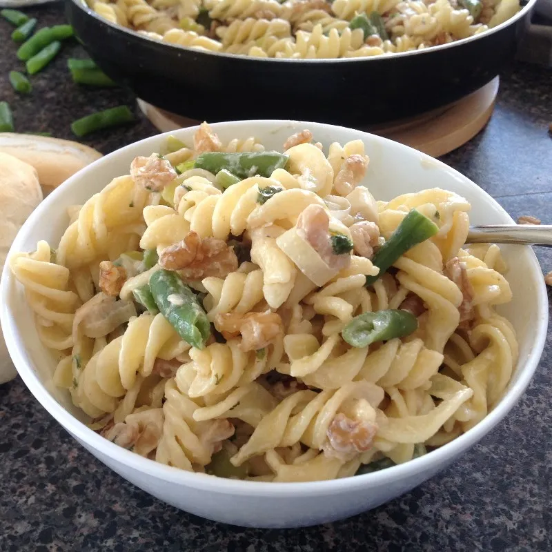 A fresh, nutty and creamy pasta dish packed with vibrant green beans and crunchy walnuts, perfect for a light yet satisfying meal.