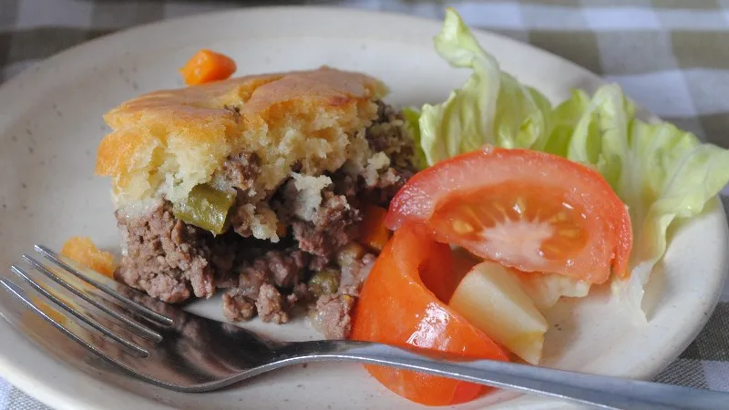 - Mix until just combined and spoon the batter evenly over the mince.