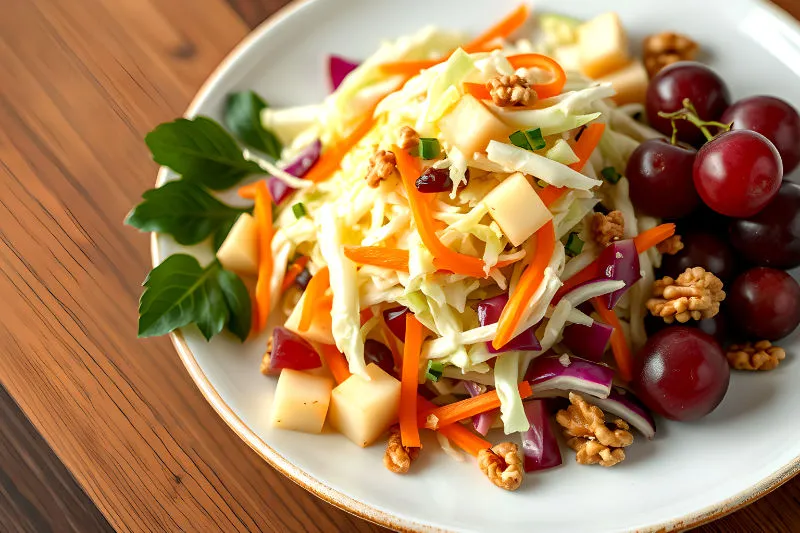 - In a large bowl, mix the 3 cups Cabbage shredded, 1 large Carrot grated, 1/2 cup Seedless red grapes halved, 1 rib Celery minced, 1/2 cup Walnuts chopped, and 2 Scallions (Spring onion) minced. Add the remaining diced apples and the blended dressing. Toss everything gently to combine.